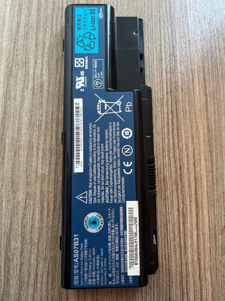 Koyu bej renkte, lityum iyon yapısına sahip dizüstü bilgisayar pil ünitesi, güvenlik sertifikaları ve etiketleri ile donatılmıştır.