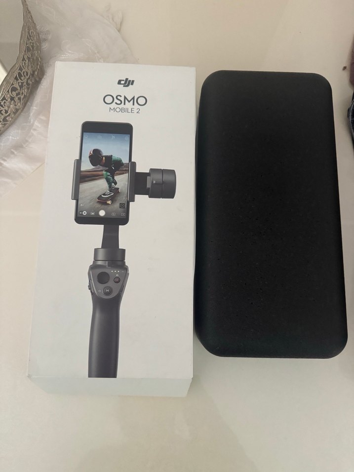 DJI Osmo Mobile 2, telefonlar için koyu gri renkli aksiyon kamerası sabitleyicisidir ve koruyucu kılıfla birlikte gelir.