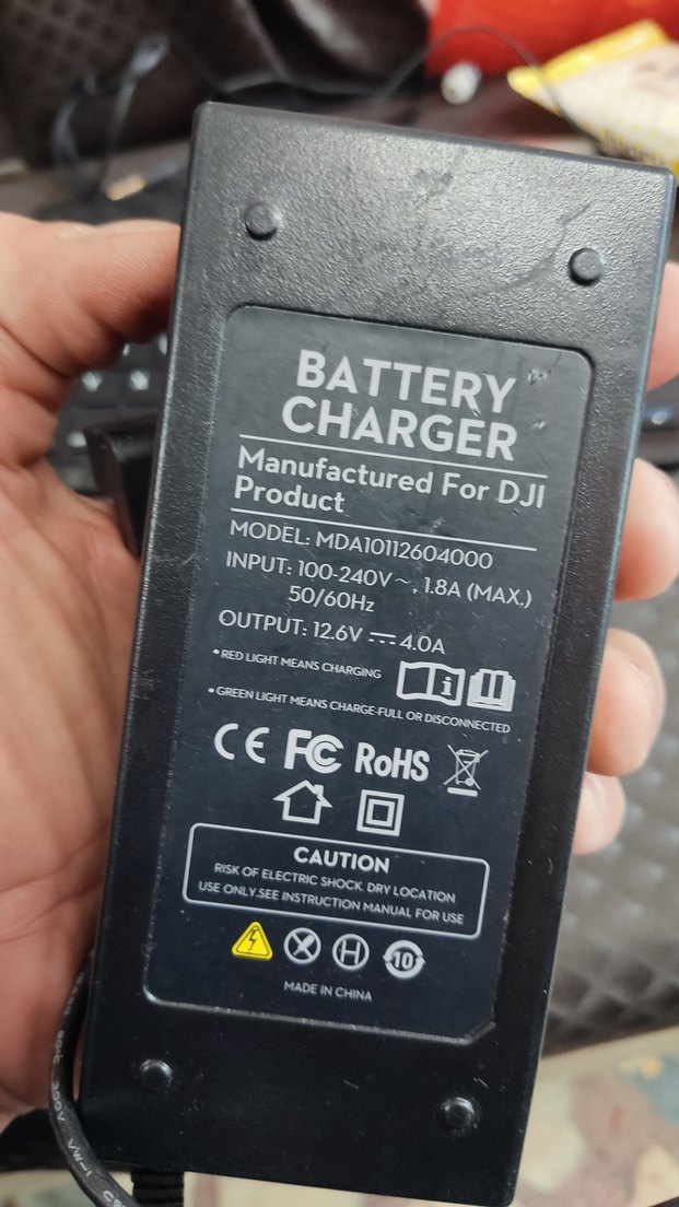 DJI ürünleri için 100-240V girişli, 12.6V 4A çıkışlı siyah batarya şarj cihazı, güvenlik sertifikaları ve şarj göstergelerine sahiptir. ⚡