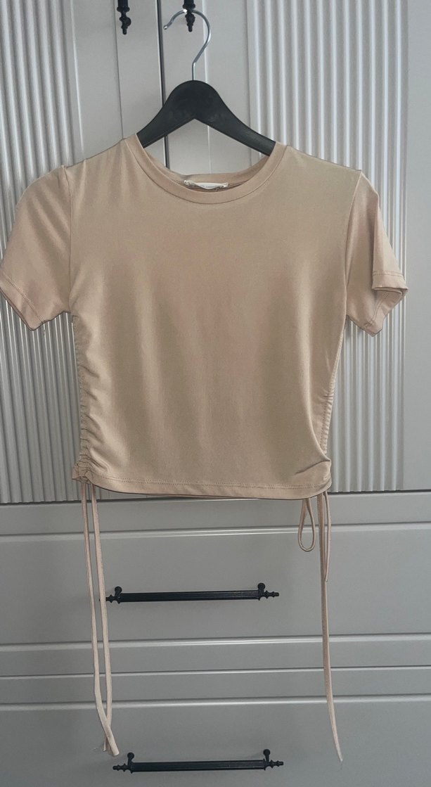 Bej renkli, kısa kollu ve dar kesim mini tişört. Yumuşak keten kumaştan üretilmiş, ayarlanabilir yan bağcıklarıyla rahat ve şık bir görünüm sağlar.