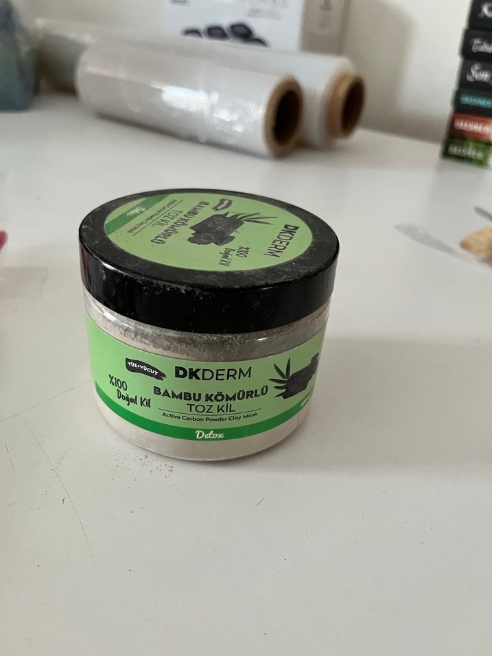 DKDERM Bambu Kömürü Toz Kil, doğal kil ve bambu kömürü içerir, cildi derinlemesine temizler ve detoks yapar.