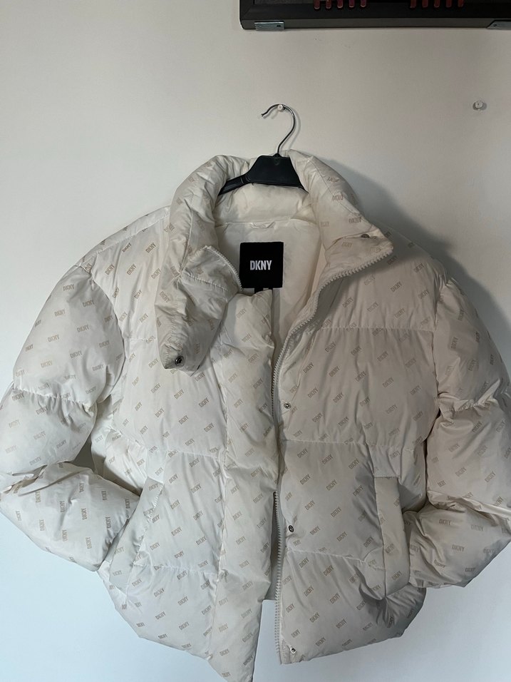 DKNY markalı beyaz kadın mont, yüksek yakalı ve düğmeli kapamalı. Bol kesim, askılı kol ve kısa boyda, yumuşak ve sıcak kumaştan. Karanlikta koyulasan gri mini logolarla rahat sokak stili için uygun.