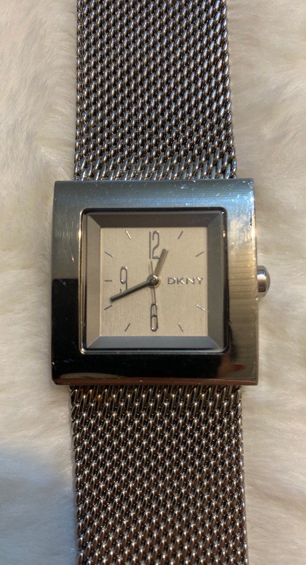 DKNY markalı, gri kare kadranlı ve tokalı metal örgü kayışlı kadın kol saati, çağdaş iş tarzına uygun.pili yok orjnal
