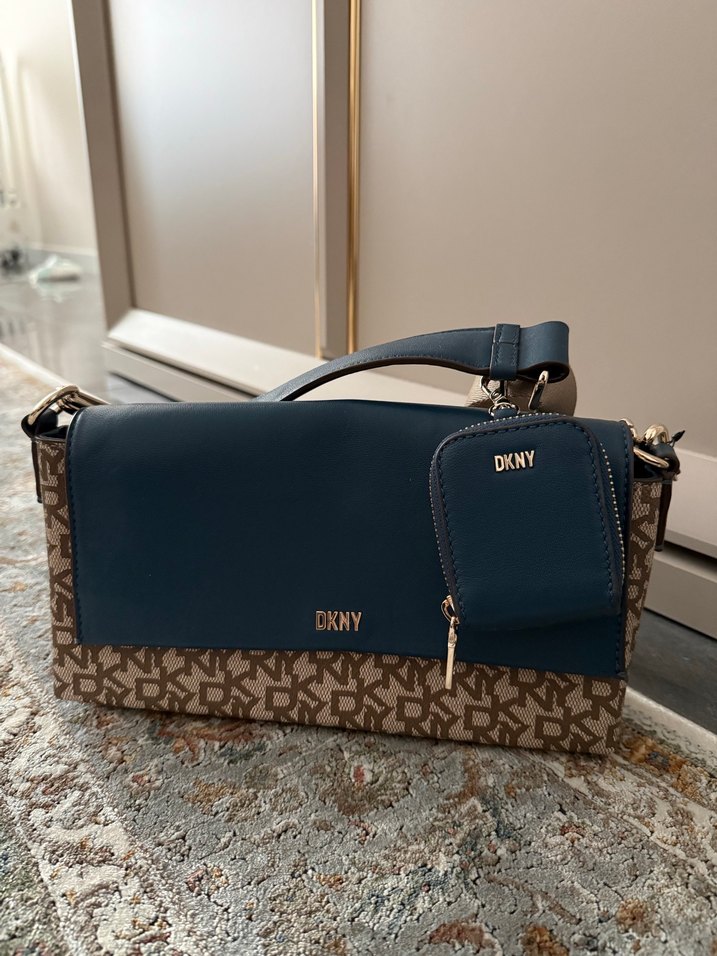 DKNY lacivert deri kadın çapraz çanta, baskılı desenli ve tokalı detaylara sahip, klasik zarafetle modern tarzı birleştirir.