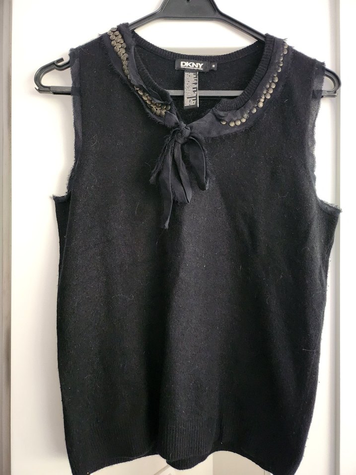 Siyah, kolsuz, yaka ve kolları zımba ve tül detaylarla hareketlendirilmis yün, ipek , cashmere karisimli şık , etiketsiz ama giyilmemis kadın süveter.