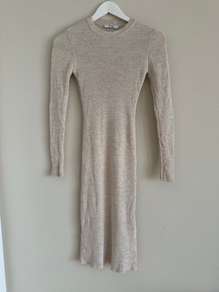 Bej renginde, triko dokulu, uzun kollu ve bisiklet yaka, triko, vücuda oturan uzun elbise. Rahat ve şık günlük sokak stili için uygundur. boy 105cm gogus 33cm 60cm esneyebiliyor