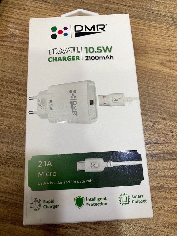 DMR seyahat şarj cihazı, 10.5W güç, 2.1A çıkış ve 2100mAh kapasite sunar. 1m Micro USB veri kablosu, akıllı koruma ve hızlı şarj için akıllı chipset içerir. ⚡