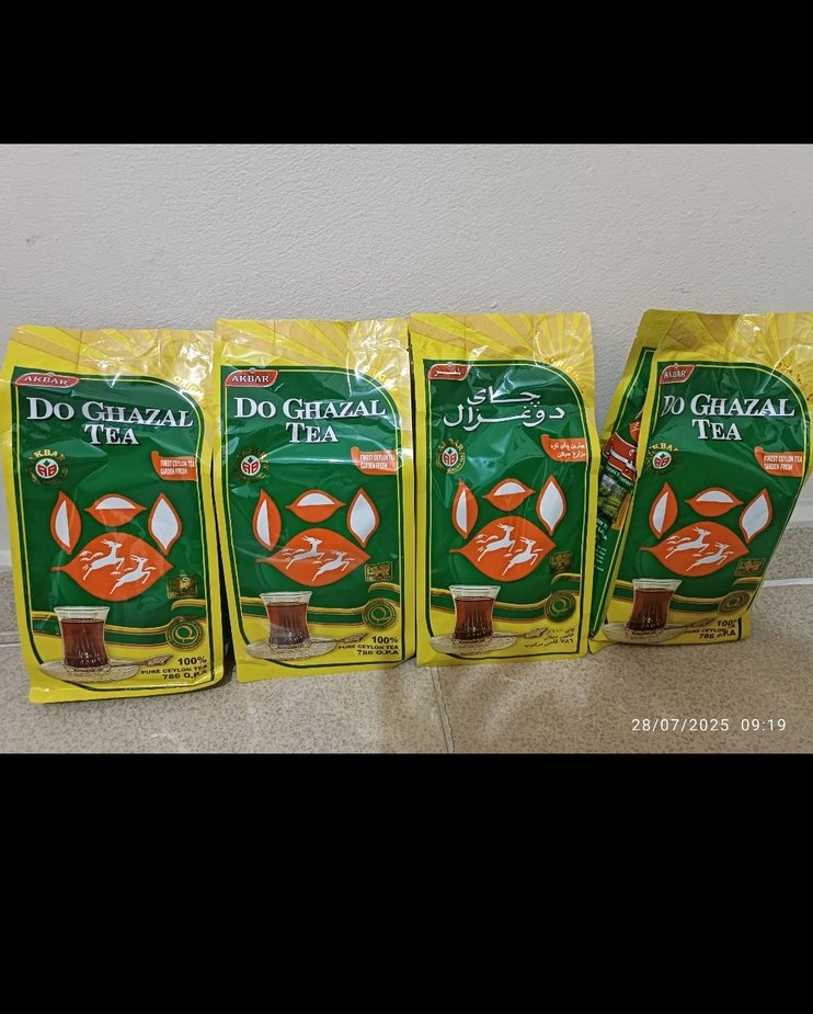 Do Ghazal Çayı, önünde çay yaprakları ve bardak figürü bulunan 100g sarı-yeşil paketlerde sunuluyor. Son kullanma tarihi 28/07/2025.