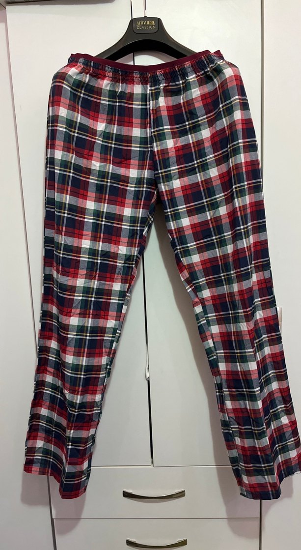 Do Re Mi marka, pamuklu kareli erkek pijama altı. Çok rahat bir kumaşa sahip, günlük kullanım için ideal. Temiz, yırtık/defolu hiçbir yeri yok. Bel lastiği sağlam, formu bozulmamış.