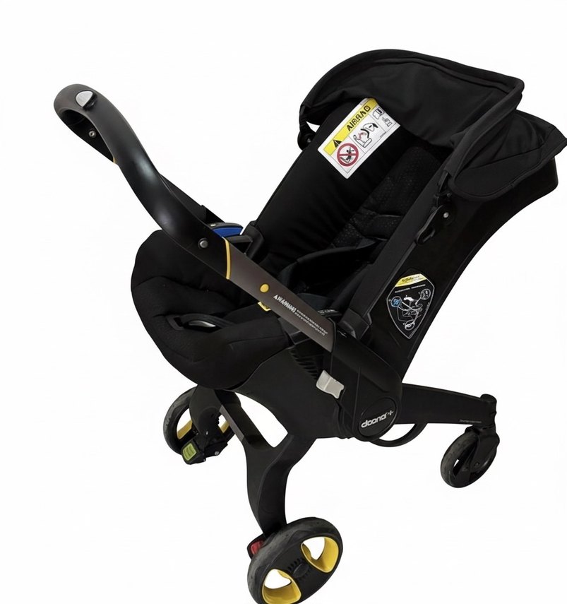 Kompakt tasarımlı, siyah bebek arabası, kolay manevra için pürüzsüz tekerleklerle. Güvenlik etiketleri ve sağlam çerçeve içerir.