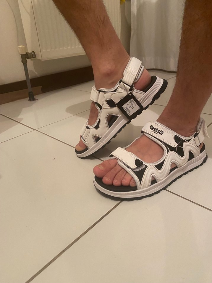 Dockers markalı beyaz kauçuk erkek spor sandalet, tokalı ve baskılı detaylara sahip. Sokak modası ve rock punk tarzını yansıtıyor.