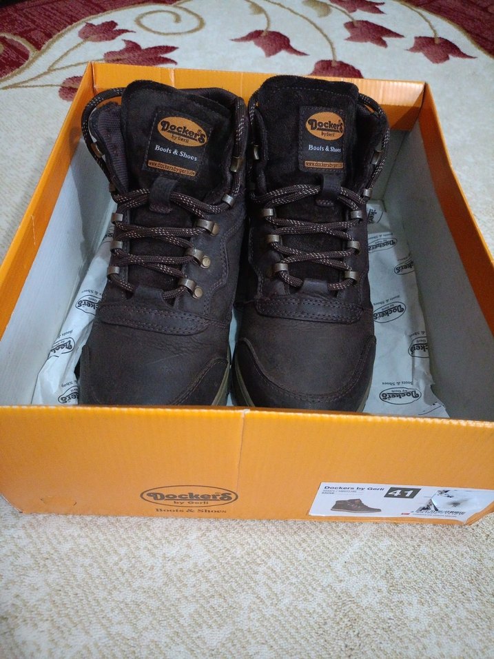 Dockers marka, koyu kahverengi kauçuk malzemeden yapılmış, tokalı erkek biker botları, dış mekan için uygundur.