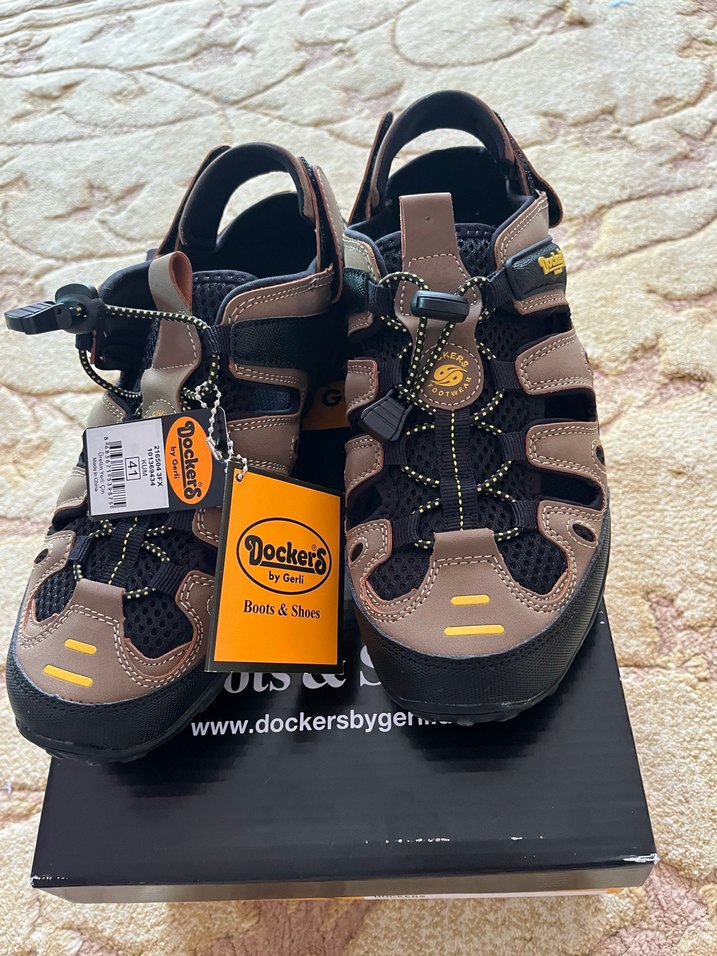 Dockers markalı, kayışlı ve baskılı detaylara sahip kahverengi erkek biker tarzı sandalet, dayanıklı kauçuk malzemeden üretilmiştir.