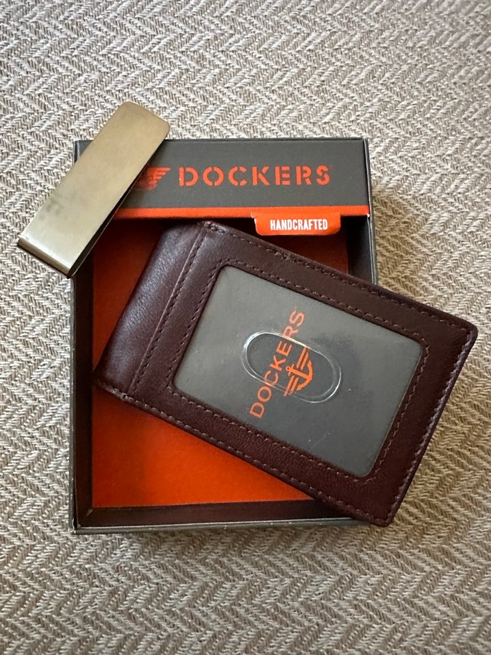Dockers markalı kahverengi deri cüzdan, baskılı tasarım ve el işçiliği detaylarına sahip. Metal para klipsi ve şeffaf kimlik penceresi içerir.
