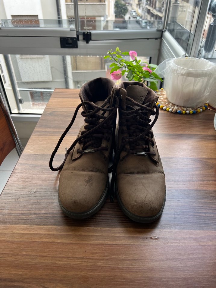 Ürün fotoğraflarda göründüğü gibidir.kesinlikle orijinaldir.Flo mağazasından satın almıştım.41 numaradır.uzun zamandır kullanıyorum o yüzden kullanımdan kaynaklı olarak botta deformasyonlar mevcuttur,bu nedenle fiyatını uygun tutuyorum.Son iki fotoda göstermeye çalıştım burun kısmında biraz yıpranma ve sol ayakta ufak bir yırtık vardır.onun dışında herhangi bir sorunu yoktur.