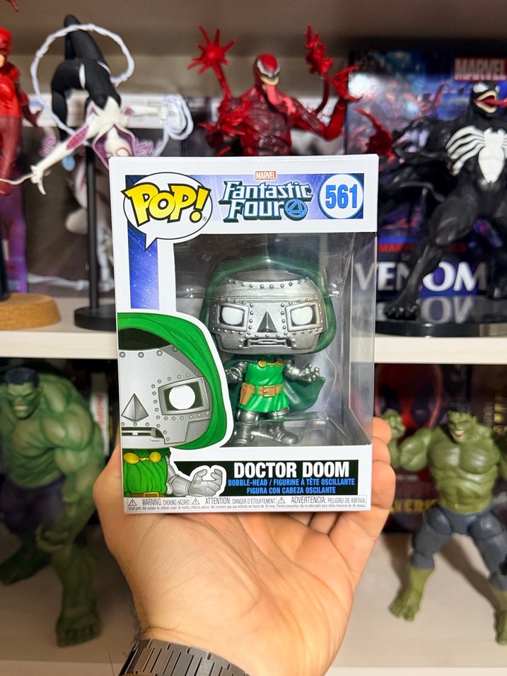 Fantastik Dörtlü Doctor Doom aksiyon figürü, koyu yeşil kıyafet ve metalik maske ile kutusunda sunuluyor. ♂️