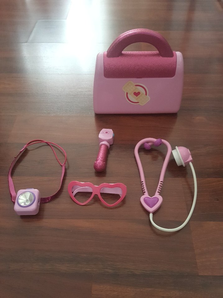 Doctor Mcstuffins Doktor çantası Alına takılan ışığa pil takılması gerekiyor.Sadece tutulan Canta sapindaki simlerde cok hafif azalma var.Şuan piyasada yok.Sadece Yurtdisinda var.Bu ayrintilar dısinda tertemiz.Pembe renkli bu eğitici oyuncak setinde çanta, stetoskop, gözlük, saat ve küçük bir el feneri bulunur.