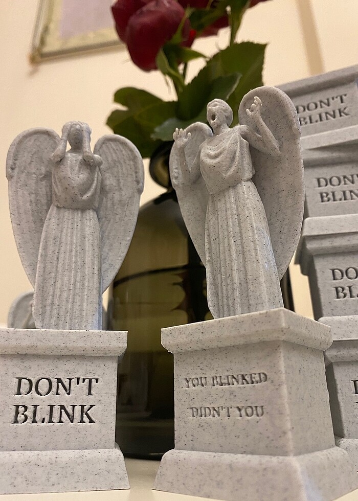 sevilen doctor who dizisinin en ikonik varlıklarından olan ağlayan meleklerin minik 3D basım heykelleri. içerik olarak bi̇r adet yüzünü kapatan melek bir adet bağıran melek ve bir adet de platform var.