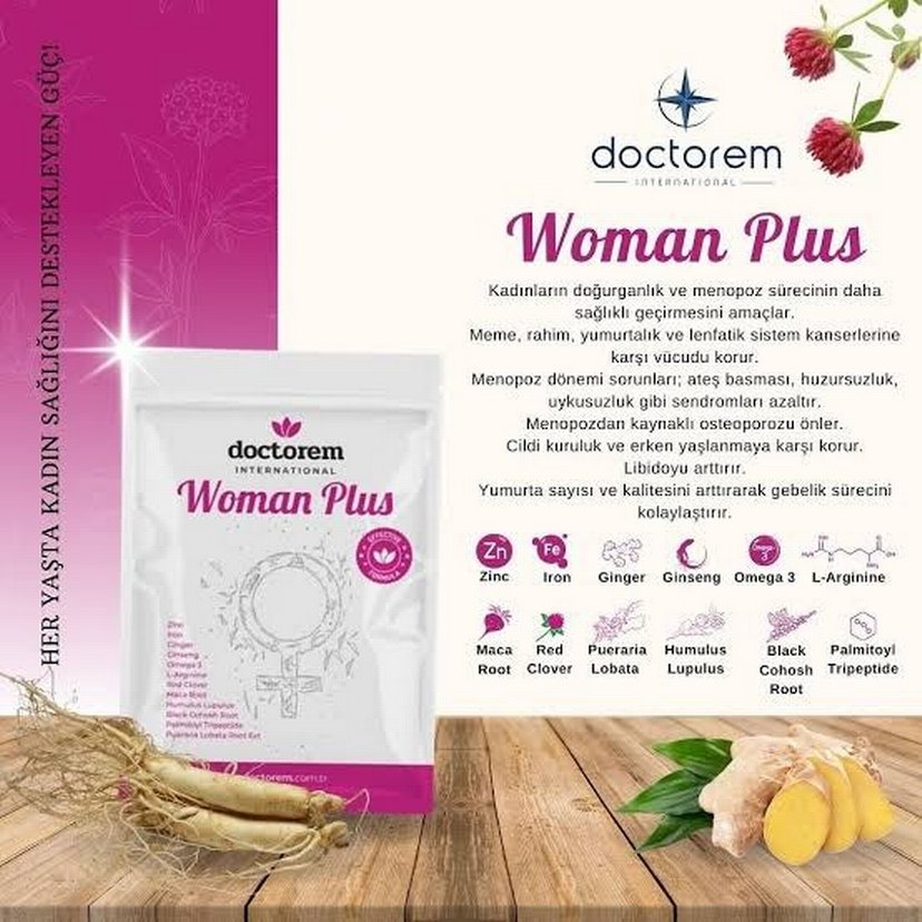 Doctorem Woman Plus, zencefil, ginseng, maca ve omega gibi bileşenlerle kadınların doğurganlık ve menopoz sürecini destekler, vücudu korur ve cildi iyileştirir.