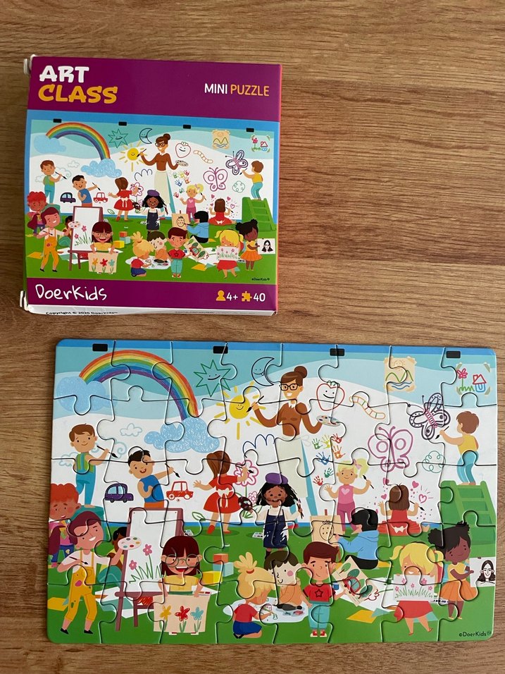 Doerkids mini yapboz, gökkuşağı altında resim yapan ve oynayan çocukların renkli açık hava sanat sınıfı sahnesini içerir. 40 parçadan oluşur. Tane adeti 50₺
