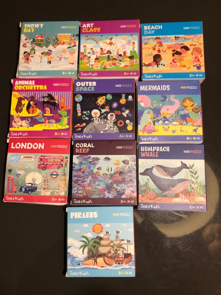 Doerkids mini yapboz seti, deniz kızları, uzay, korsanlar gibi 10 renkli temayı içerir, 3 yaş ve üzeri çocuklar için uygundur. Eksik parçaları yok.