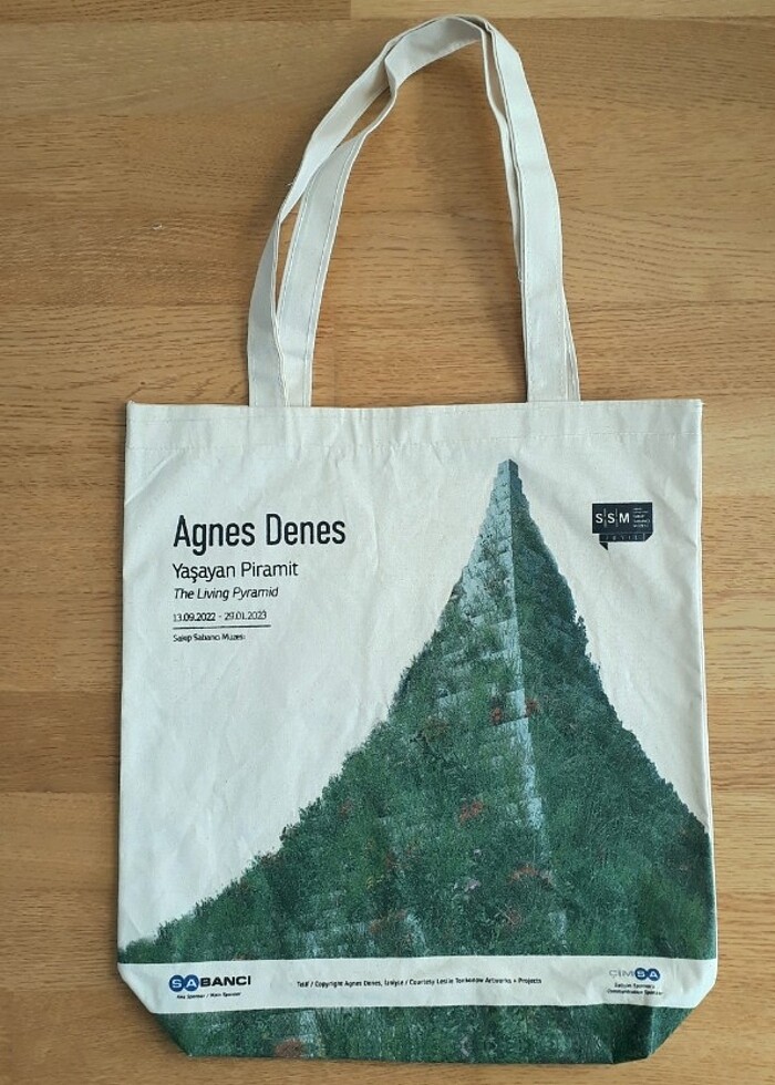 "Gelecek henüz el değmemiş ve kırılgan, itinayla davranın." Sakıp Sabancı Müzesi'ndeki Agnes Denes: Yaşayan Piramit sergisi için baskılı bez çanta. Yepyeni, tertemiz, hiç kullanılmadı. Kalın pamuklu kumaş. 38 x 40 cm. 7 cm körüklü.