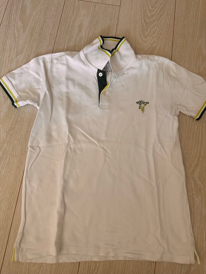 Beyaz pamuklu, kısa kollu, yakalı ve düğmeli polo tişört. Baskılı detaylı ve dar kesim, günlük sokak tarzına uygun. Ön yüzünde leke var detaylar resimde mevcut