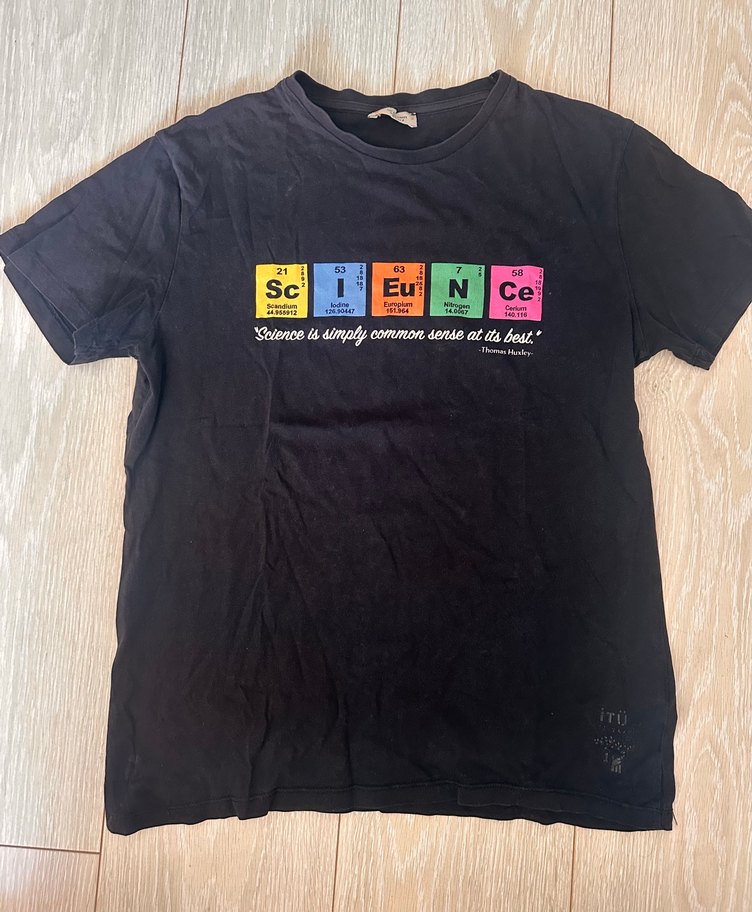 siyah, pamuklu, baskılı ve fitted kesim tişört. Kısa kollu ve yuvarlak yaka, renkli 'Science' baskısı ve altta alıntı bulunur. M beden doğa koleji