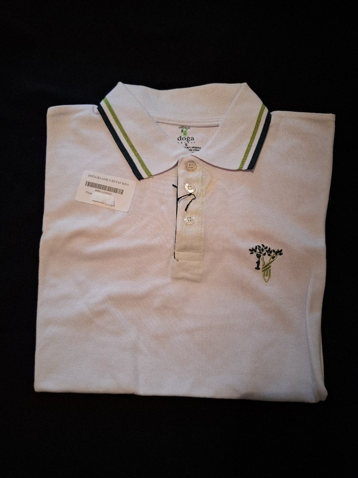 Doğa Koleji kıyafeti hiç kullanılmamış etiketi üstünde görselde bedeni yazıyor Beyaz pamuklu, kısa kollu, düğmeli polo yaka tişört,