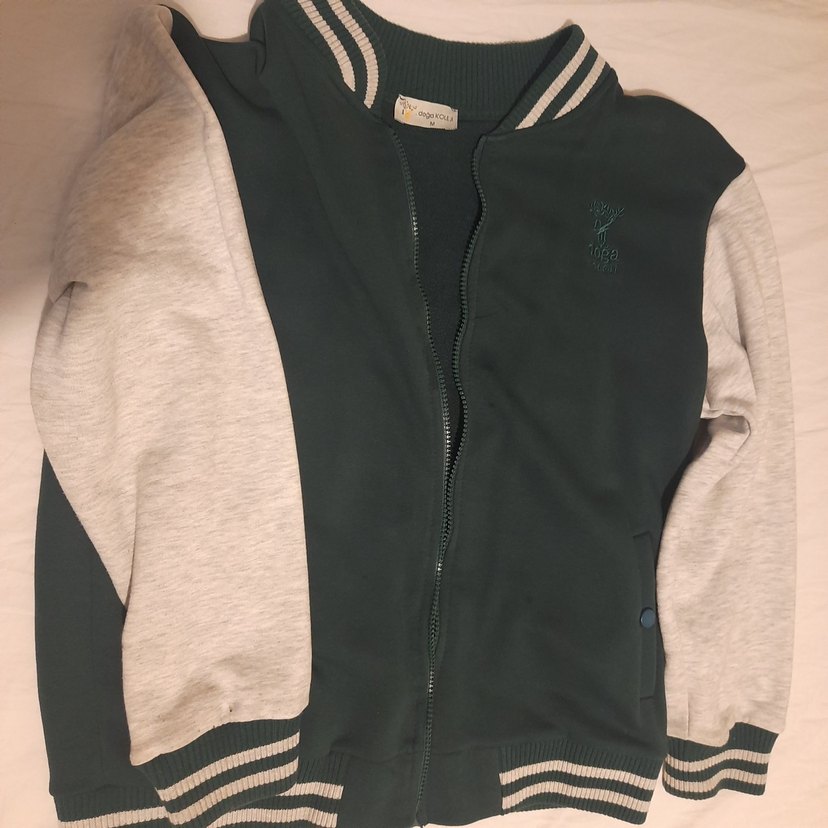 Fermuarlı önü haki renkte doğa koleji sweatshirt önünde birkaç yağ lekesi var ama çok dikkatli bakınca belli oluyor