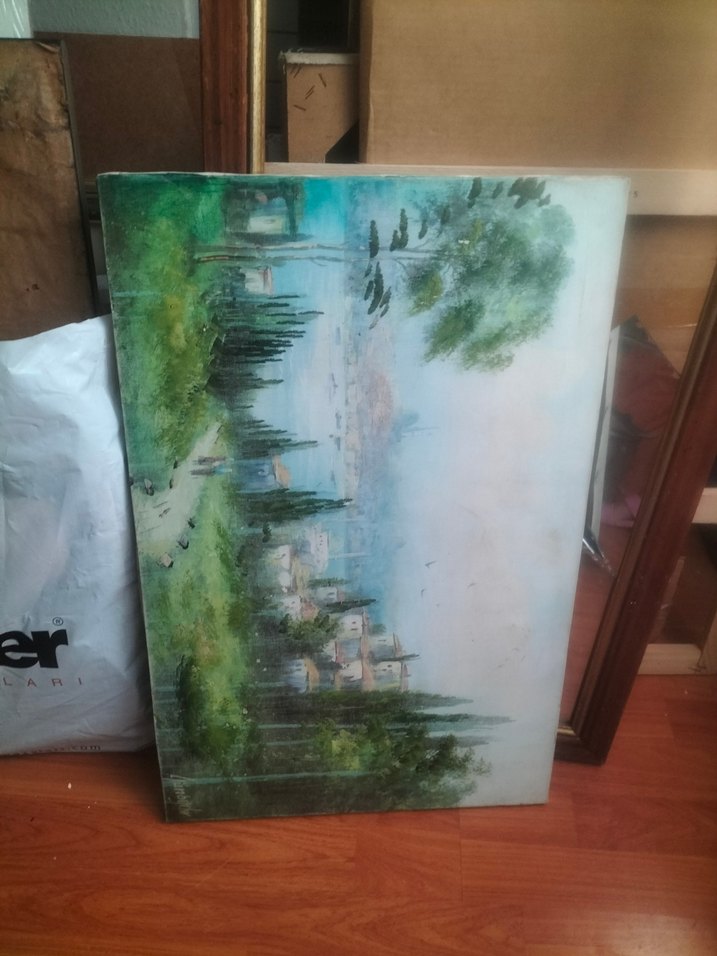 Koyu tonlarda ve haki renklerle ağaçlar ve binaların yer aldığı sakin bir nehir manzarası tablosu. Doğal bir ortamı yansıtıyor.