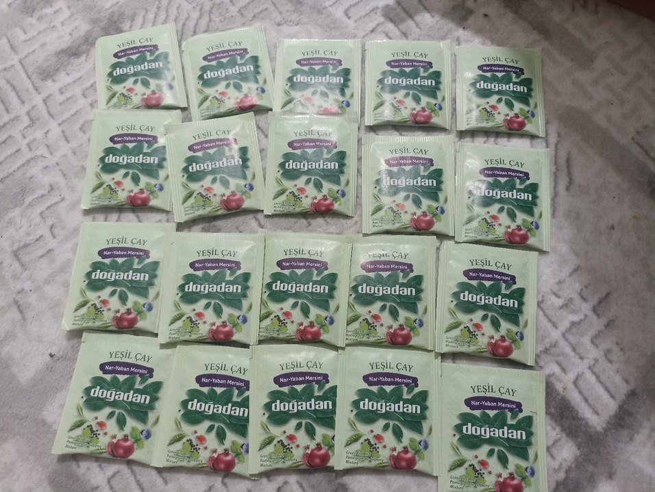 Dogadan markasına ait nar-yaban mersini aromalı 20'li yeşil çay poşetleri.