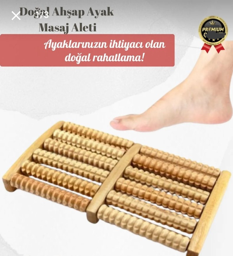 Doğal ahşaptan üretilmiş, ayaklar için rahatlatıcı masaj sağlayan, çoklu yuvarlanan çubuklara sahip masaj aleti. Açık camel renkte.