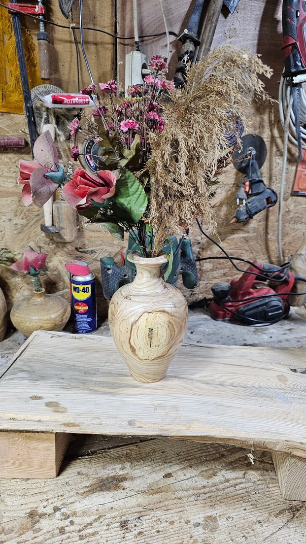 Doğal ahşaptan yapılmış, beyaz tonlarında klasik şekilli vazo, ölçü resimlerde mevcuttur