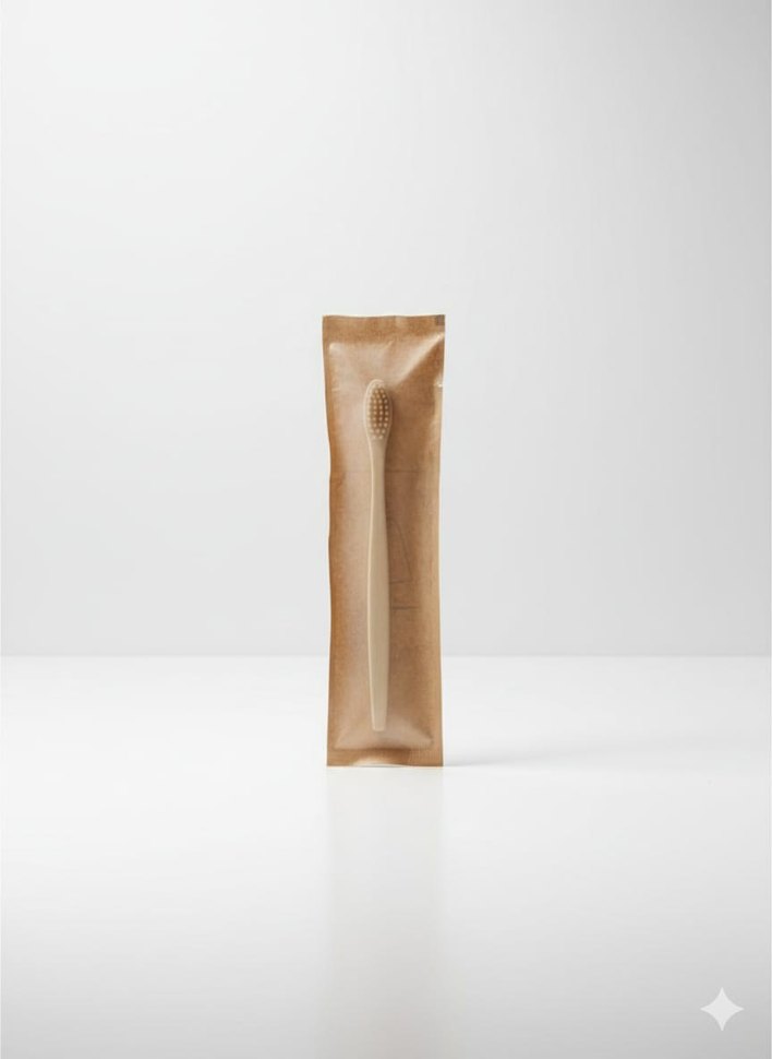 Doğal ahşaptan yapılmış diş fırçası, çevre dostu ambalajda sunulur ve sürdürülebilir ağız bakımı sağlar.
