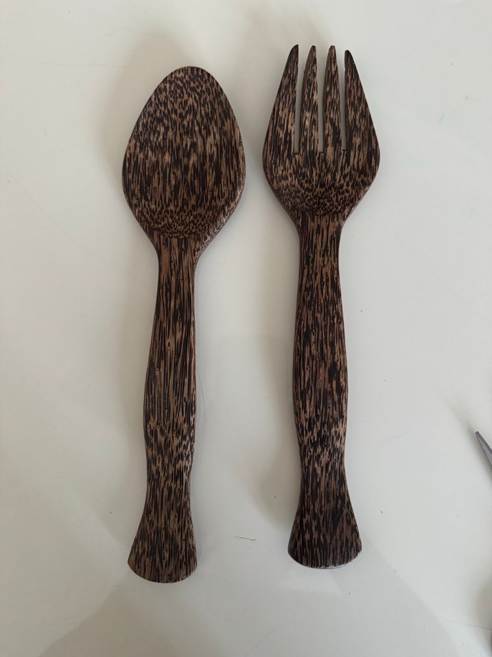 Doğal dokulu koyu kahverengi ahşap kaşık ve çatal seti, pürüzsüz yüzeye sahiptir.