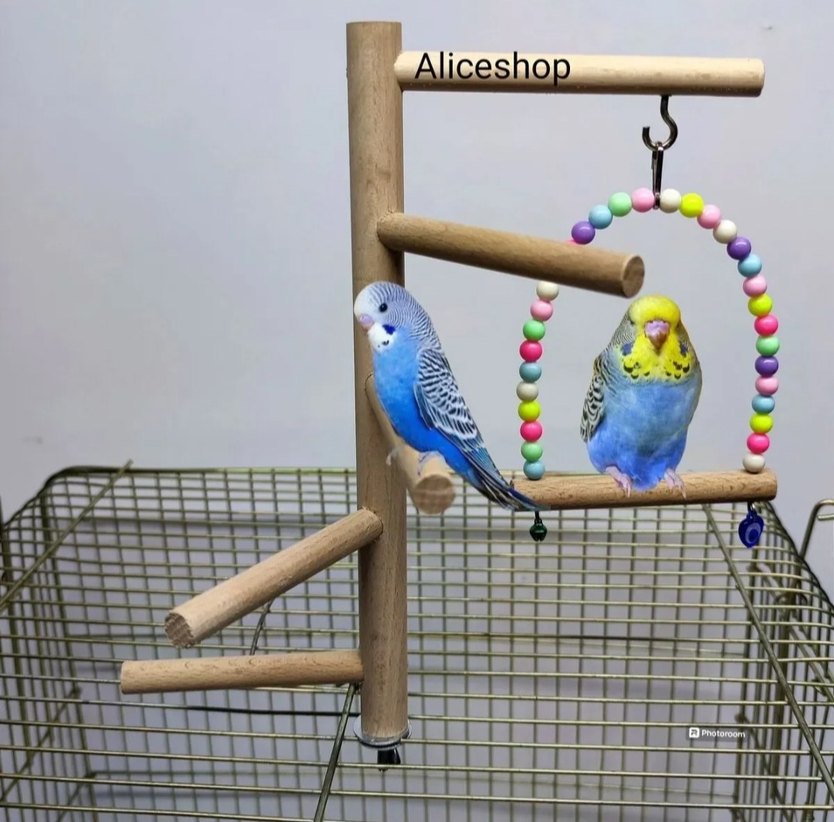 Doğal ahşap, renkli boncuklarla süslenmiş ahşap kuş oyuncağı ve tırmanma çubuğu, Aliceshop markalı. Küçük kuşlar için uygun.
