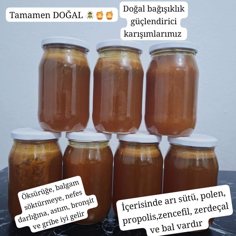Arı sütü, propolis, zencefil ve bal içeren doğal bağışıklık güçlendirici karışımlar. Astım, bronşit, öksürük, balgam ve gribe iyi gelir. kendi yaptığımız karışımlarımız