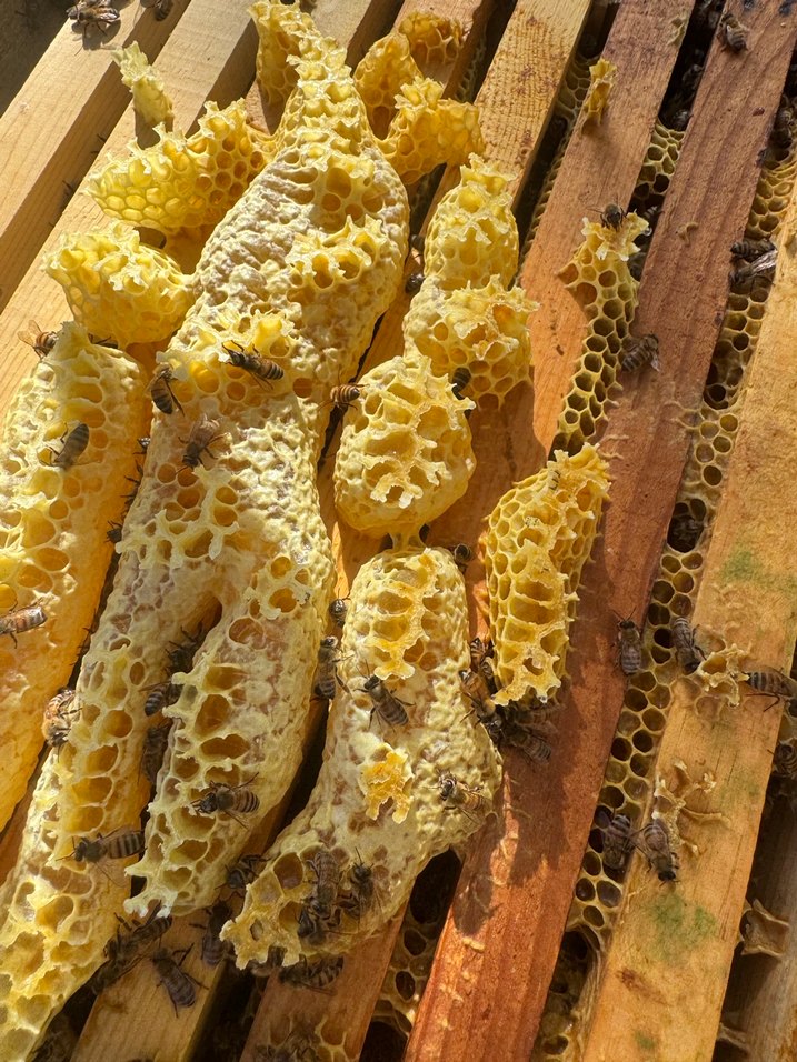Ahşap çerçeveler üzerinde arılarla doğal bal peteği, taze bal üretimi devam ediyor.
