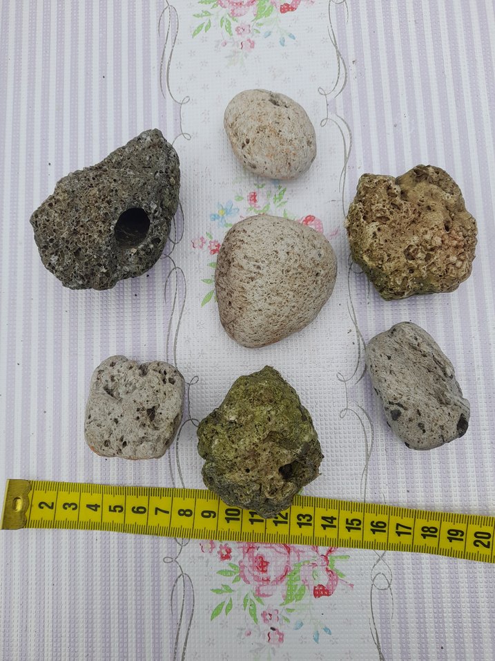 Farklı haki ve gri tonlarında, düzensiz şekilli ve pürüzlü dokulu dekoratifakvaryumtaşları .