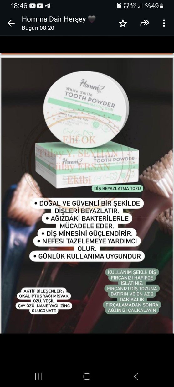 Pastel haki renkte doğal diş beyazlatma tozu. Dişleri güvenli şekilde beyazlatır, ağızdaki bakterilerle mücadele eder, diş minesini güçlendirir ve nefesi tazeler. Günlük kullanıma uygundur. bilgi için dm