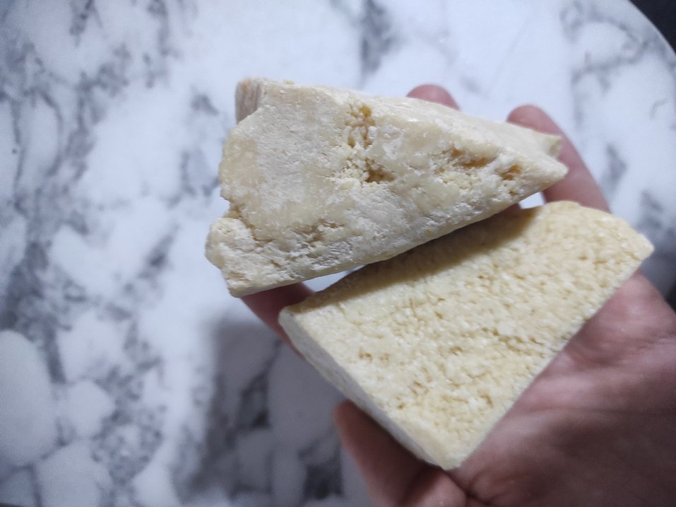 Doğal malzemelerden yapılmış, pürüzlü dokulu el yapımı sabun. Nazik temizlik sağlar.