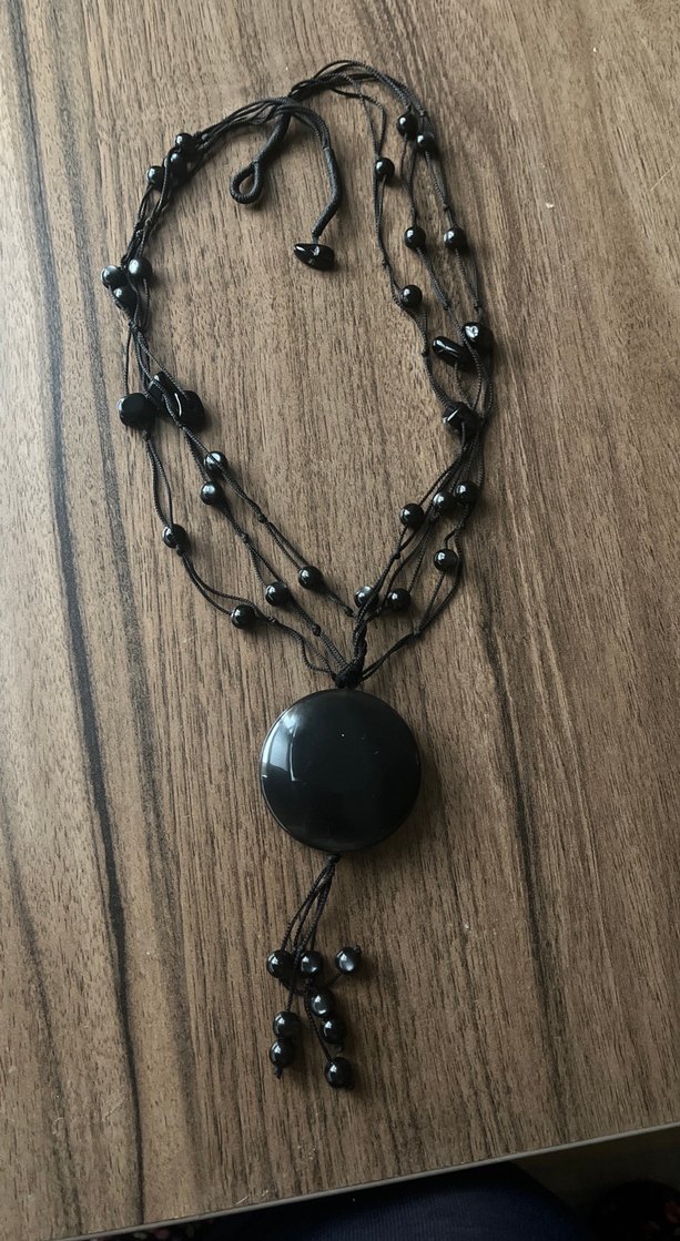 Uzun siyah boncuklu, bağlama desenli gotik tarzda kolye. Günlük kullanım için uygun, bohem ve retro havası taşıyor.