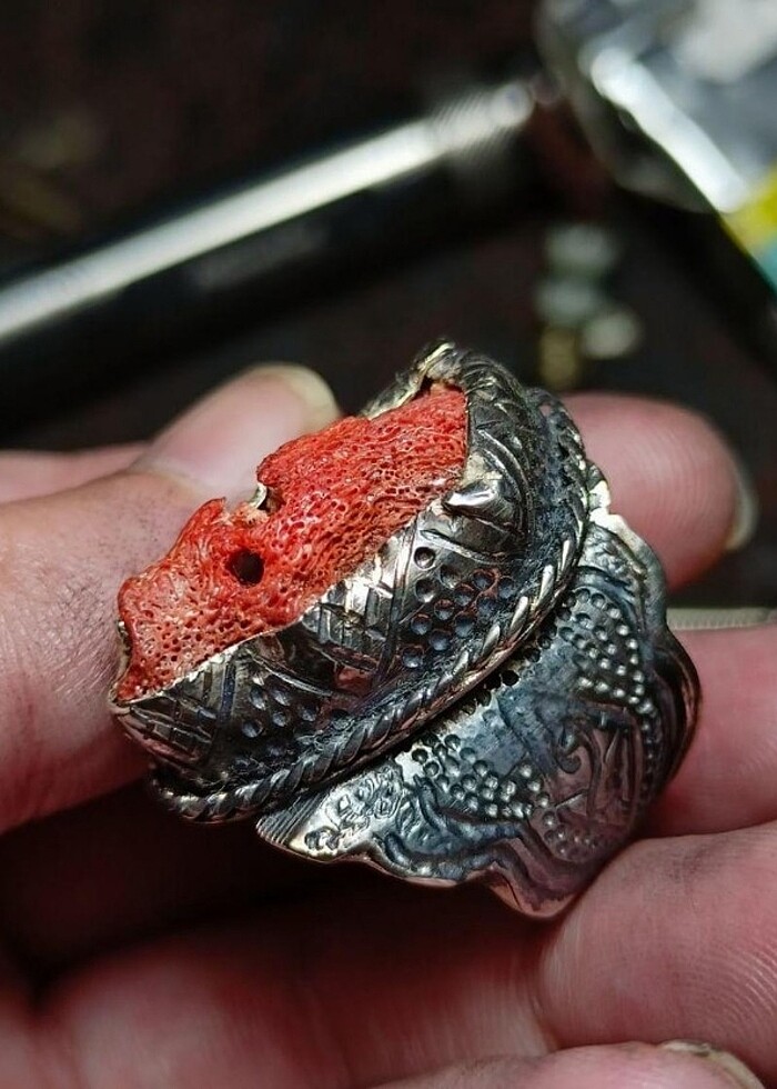 Doğal ham orjinal kırmızı mercan el yapımı gümüş yüzük.