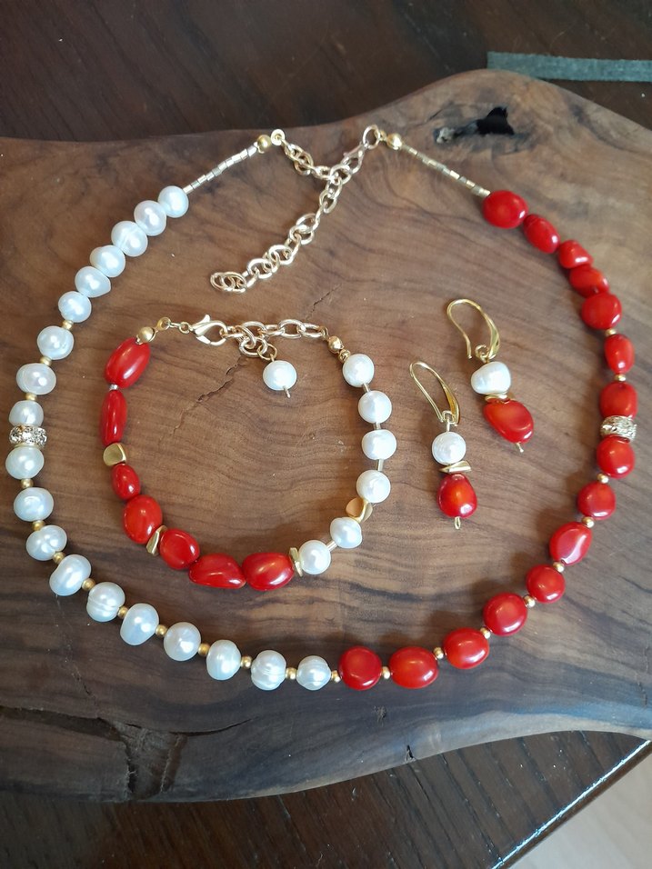 Gerçek 8mm inciler ve doğal mercanlarla tasarlanmış ,zirkon taşlı altın kaplama aparatlı,kolye, küpe ,bileklik takım. Bohem ve şık. Hediye kutusu ile gönderilecektir. Gardropsumdaki diğer ürünlere bakmadan geçmeyin.