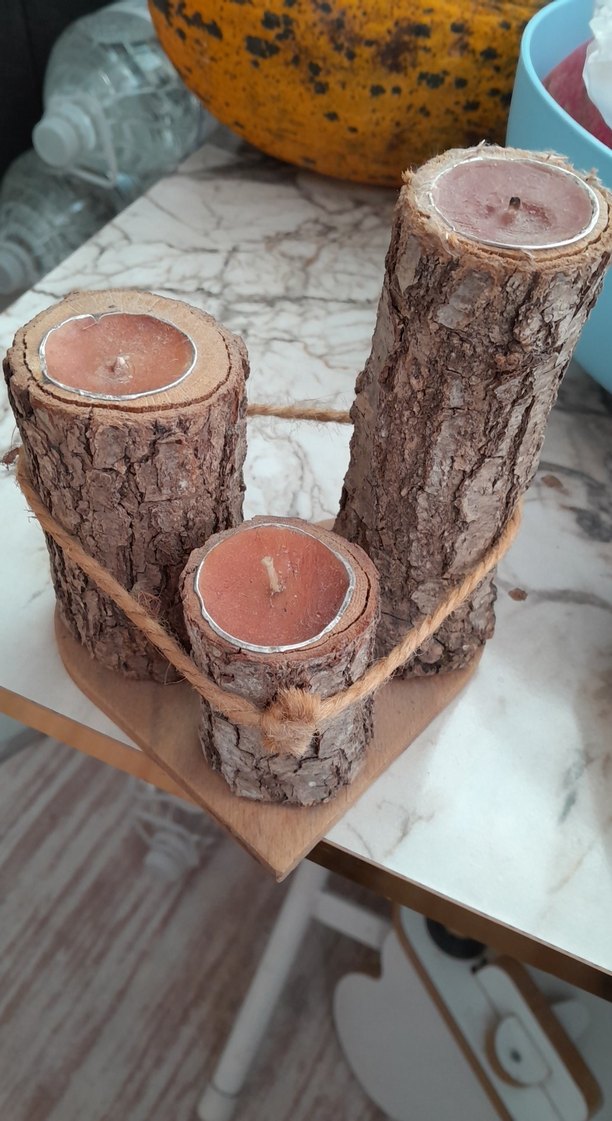 Doğal kütük mumluklarda üç adet bej renk mum, rustik ip ile bağlanmış ahşap taban üzerinde yer alıyor. ️