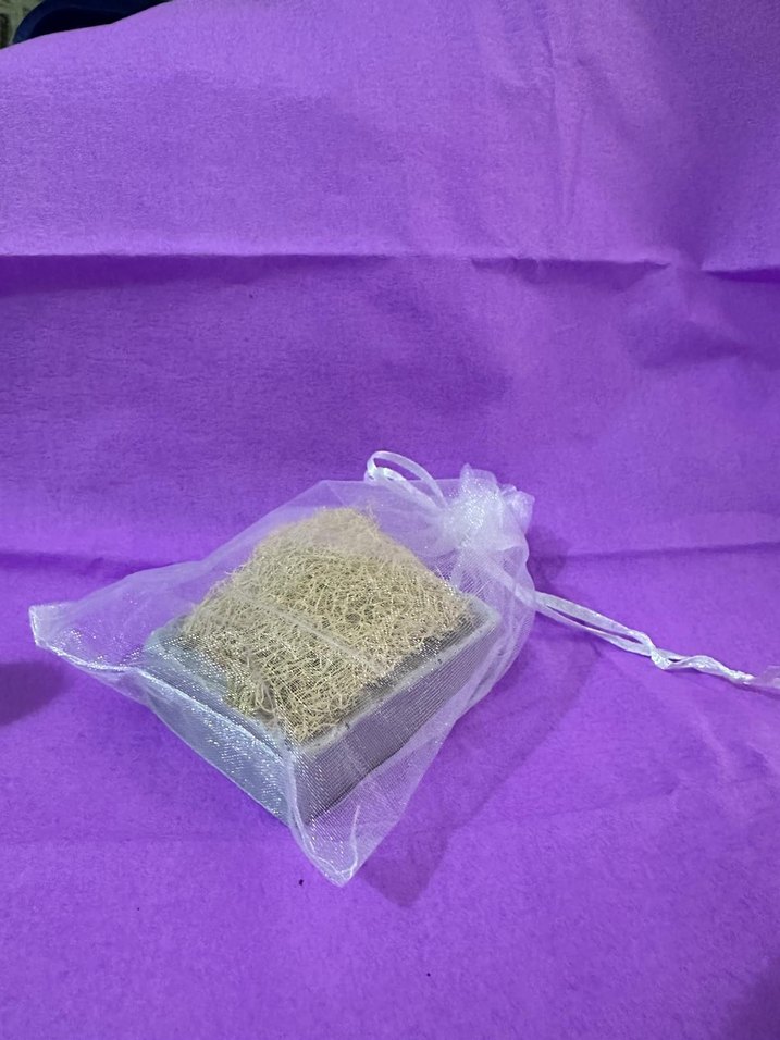 Doğal sabun ve peeling lifinden oluşan, şeffaf bağcıklı torbada paketlenmiş set. Cilt bakımı için nazik temizleme sağlar.