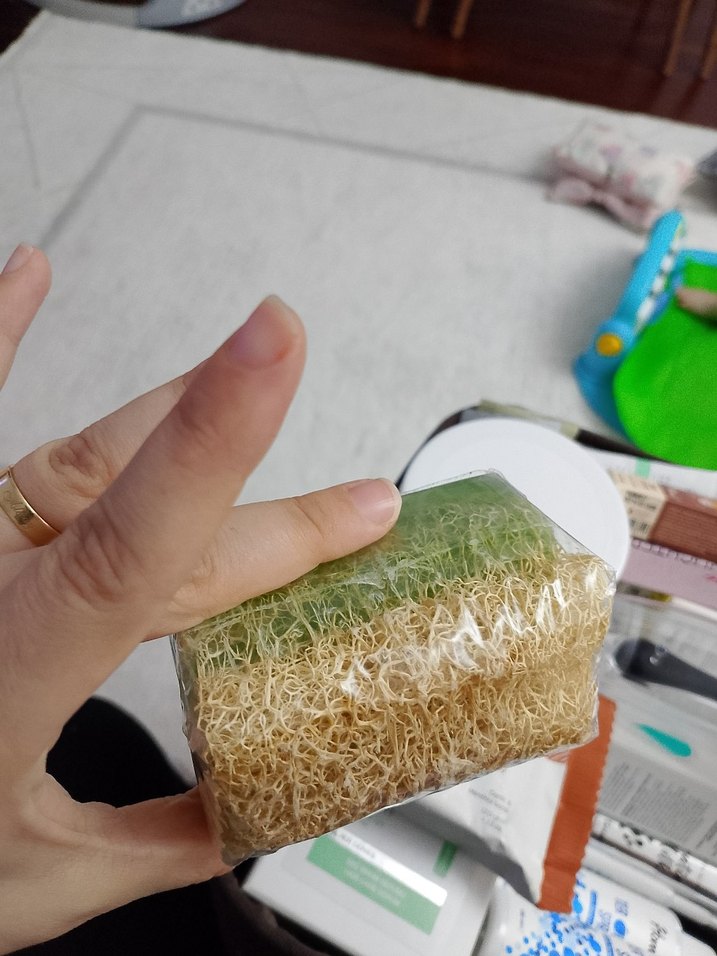 Nazik temizlik ve cilt bakımı için doğal lif katmanlarına sahip sabun.