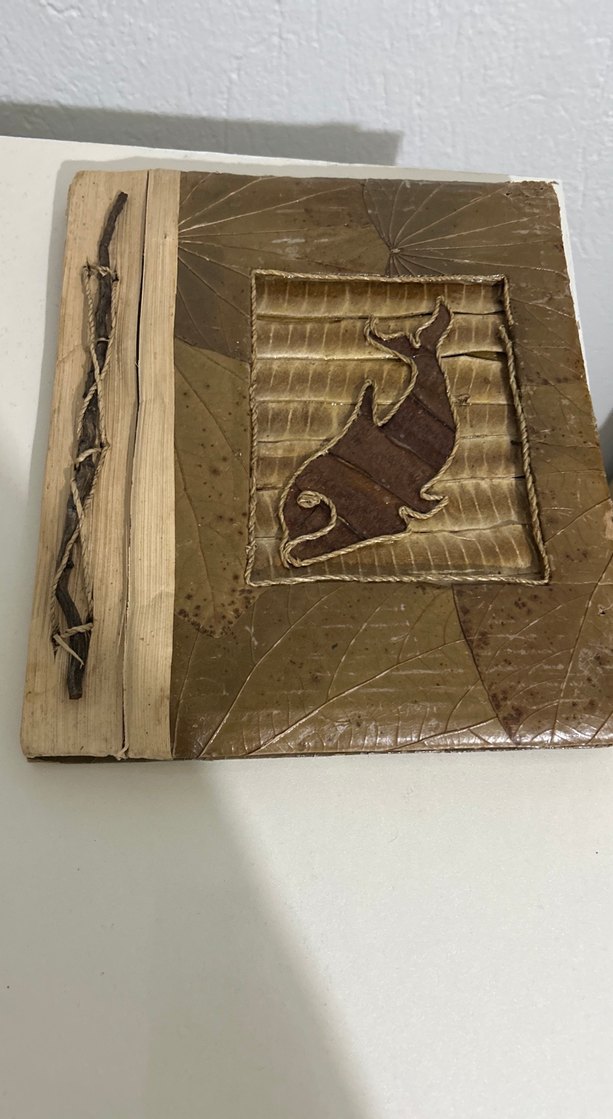 Yaprak kapaklı, balık desenli ve ip bağlamalı ahşap sırtlı el yapımı sanat defteri.