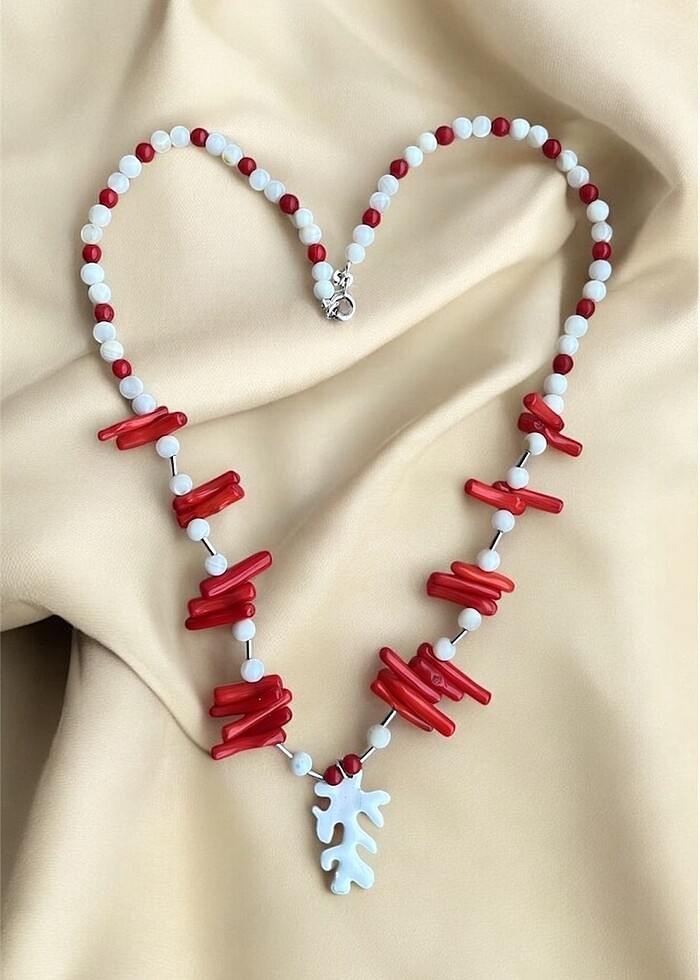 43 cm boya sahip ancak isteğe göre uzatma takılabilir. Doğal mercan, doğal sedef, el yapımı sıcak mine ve gümüş aparatlarla tasarlanmıştır. Kolyemiz çift taraflıdır. Detaylı bilgi için iletişime geçiniz.
